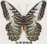 中等大小。前翅長40毫米,翅面灰綠色,自翅基部向外有縱行斜帶,前線下方至中室內側呈棕黑色,內有3個不規(guī)則的淡黃色斑,中室以外至外線間有白色寬帶,棕褐色的翅脈極為明顯,外線至外緣間棕黃色,內有黑色橫紋,外緣鑲有黑白相間的緣毛;后翅基部粉綠色,中線由黑色斑點組成,外線呈放射性縱紋及三角形黑斑,外嵌淡黃色邊,外緣黑白相間,構成極為美麗的圖案,雙翅半垂半攏時尤為美觀。分布于西南邊陲的亞熱帶地區(qū)。