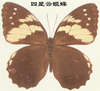 成蟲(chóng)為大型眼蝶。 翅黑色。前翅正面亞外緣有2列小白點(diǎn),內(nèi)側(cè)1列較大;前緣中部斜向后角有l(wèi)列大白斑,后3個(gè)最大;中室端也有1個(gè)大白斑。后翅正面亞外緣有1列白斑。