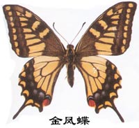 金鳳蝶又叫黃鳳蝶。翅展73-85mm。翅金黃色;前翅基部1/3處為黑色,散生黃色鱗片,中室無黃色縱線;后翅臀角橙色圓斑較大,中無黑點(diǎn)。幼蟲危害傘形花科植物如茴香等。