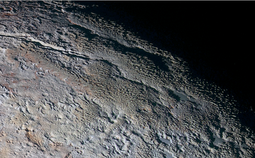冥王星上非正式名稱為塔耳塔羅斯山脊(Tartarus Dorsa)的區(qū)域刃狀的地貌,由NASA的新視野號(hào)探測器在2015年7月拍攝。(圖片提供:NASA/JHUAPL/SwRI)
