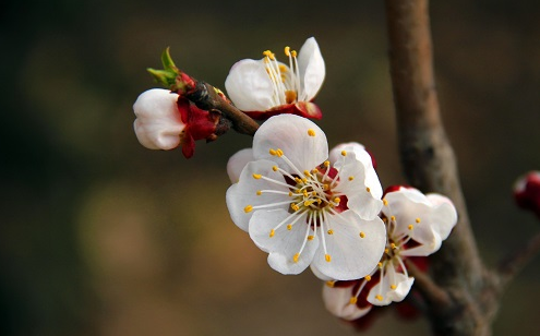 明《廣群芳譜》描述杏花:“葉似梅,差大,色微紅,圓而有尖。花二月開,未開色純紅,開時色白,微帶紅,至落則純白矣?!毙踊ㄎ撮_時純紅,說的是杏花深紅色的花萼。深紅褐色的枝條和花萼是杏花的標志,另外,含苞至初開時,花萼直立,花開后花萼常反折?;ò杲鼒A形,沒有花柄,先花后葉。這都是杏花的識別特點。