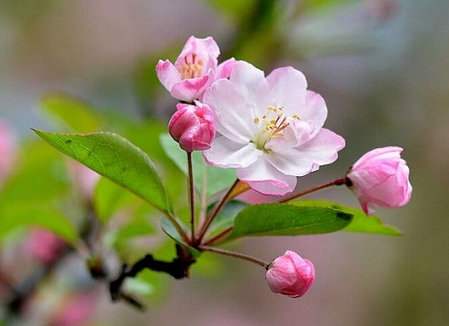 2、西府海棠,《本草綱目》中稱之為“海紅”,可入藥。花瓣也多為粉色,相對于垂絲海棠低垂下的嬌羞,西府海棠則以一種仰望天空的姿態(tài)傲然綻放。一個如小家碧玉,一個像大家閨秀,你知道怎么區(qū)分了嗎?