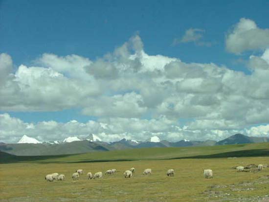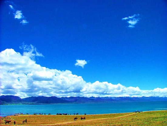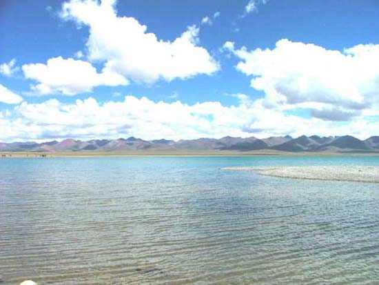 在安多附近,鐵路線又離開了公路向草原深處延伸,那里有一片純凈的湖水,那就是錯那湖。 青藏高原雖然環(huán)境惡劣,但湖泊卻星羅棋布。這些湖泊猶如一顆顆璀璨的珍珠,錯那湖就是其中閃亮的一顆,盡管它沒有青海湖的壯麗,但隨著青藏鐵路的建成通車,它已成為青藏鐵路沿線最美麗的風(fēng)景。錯那湖是青藏鐵路沿線最近的湖泊,距離青藏鐵路最近處僅幾十米。 當(dāng)你走近錯那湖你會發(fā)現(xiàn),藍(lán)得近乎透明的湖水仿佛一陣輕風(fēng)撲面而來,美麗的湖水幾乎伸手可及,成群的水鳥在湖中自由嬉戲,大群的牦牛和羊群在湖邊悠閑吃草。錯那湖是青藏鐵路沿線面積最大的淡水高原湖。發(fā)源于此的怒江、聯(lián)通河、那曲河養(yǎng)育著沿岸的藏家兒女。 湖中水產(chǎn)豐富,吸引了黑頸鶴,天鵝等國家重點(diǎn)野生保護(hù)動物。湖邊寬廣的草場則是藏羚羊和黃羊的家園。而錯那湖車站就建設(shè)在美麗的錯那湖東岸,這里肯定會成為全線最亮麗的旅游觀光車站之一。 它還是當(dāng)?shù)夭孛裥哪恐械摹吧窈,每到藏歷龍年,成千上萬的信徒前來朝拜,祈禱風(fēng)調(diào)雨順。