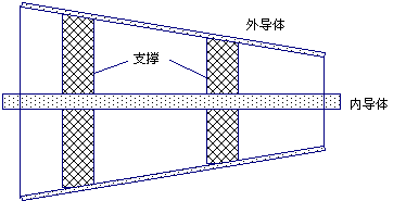 直線式漸變阻抗變換器的結(jié)構(gòu)縱剖面如圖所示,在兩端不同阻抗的同軸線之間,用外導(dǎo)體的內(nèi)徑直線連續(xù)漸變的方式進行阻抗變換。同軸線的特性阻抗與內(nèi)外導(dǎo)體的幾何尺寸有關(guān),即