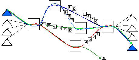 舉例來說,我們假設(shè)有A、B兩個城市,每個城市都有一部交換機并有一千個用戶,兩個交換機之間用100條中繼線連接著。那么,如果我們說:在A城的兩個用戶之間建立一條電路,我們指的是把兩條用戶線路通過A城的交換機聯(lián)接起來。但當(dāng)我們說:在A城的一個用戶和B城的一個用戶之間建立一條電路時,我們指的就是由A城的用戶線路經(jīng)A城交換機聯(lián)接到A、B城之間的一條中繼線路,在經(jīng)B城交換機聯(lián)接到B城的用戶線路上(如圖所示)。由于經(jīng)濟上的原因,中繼線路總是大大少于用戶線路,并且為所有用戶所共享。那么,當(dāng)我們占用了一條中繼線路以后,即使我們不傳送信息,別人也不能使用,這就是電路交換最主要的缺點。