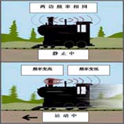 他認(rèn)為聲波頻率在聲源移向觀察者時變高,而在聲源遠(yuǎn)離觀察者時變低。一個常被使用的例子是火車,當(dāng)火車接近觀察者時,其汽鳴聲會比平常更刺耳.你可以在火車經(jīng)過時聽出刺耳聲的變化。同樣的情況還有:警車的警報聲和賽車的發(fā)動機(jī)聲。